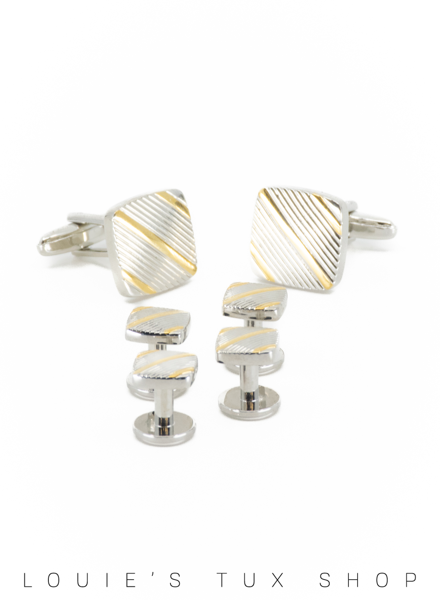 Add some elegance to your next formal outfit with this premium stud and cufflink set. Silver squares and gold stripes adds a traditional touch to any look. Comes with 4 shirt studs and 2 cufflinks that are compatible with any tuxedo shirt with the appropriate fittings.