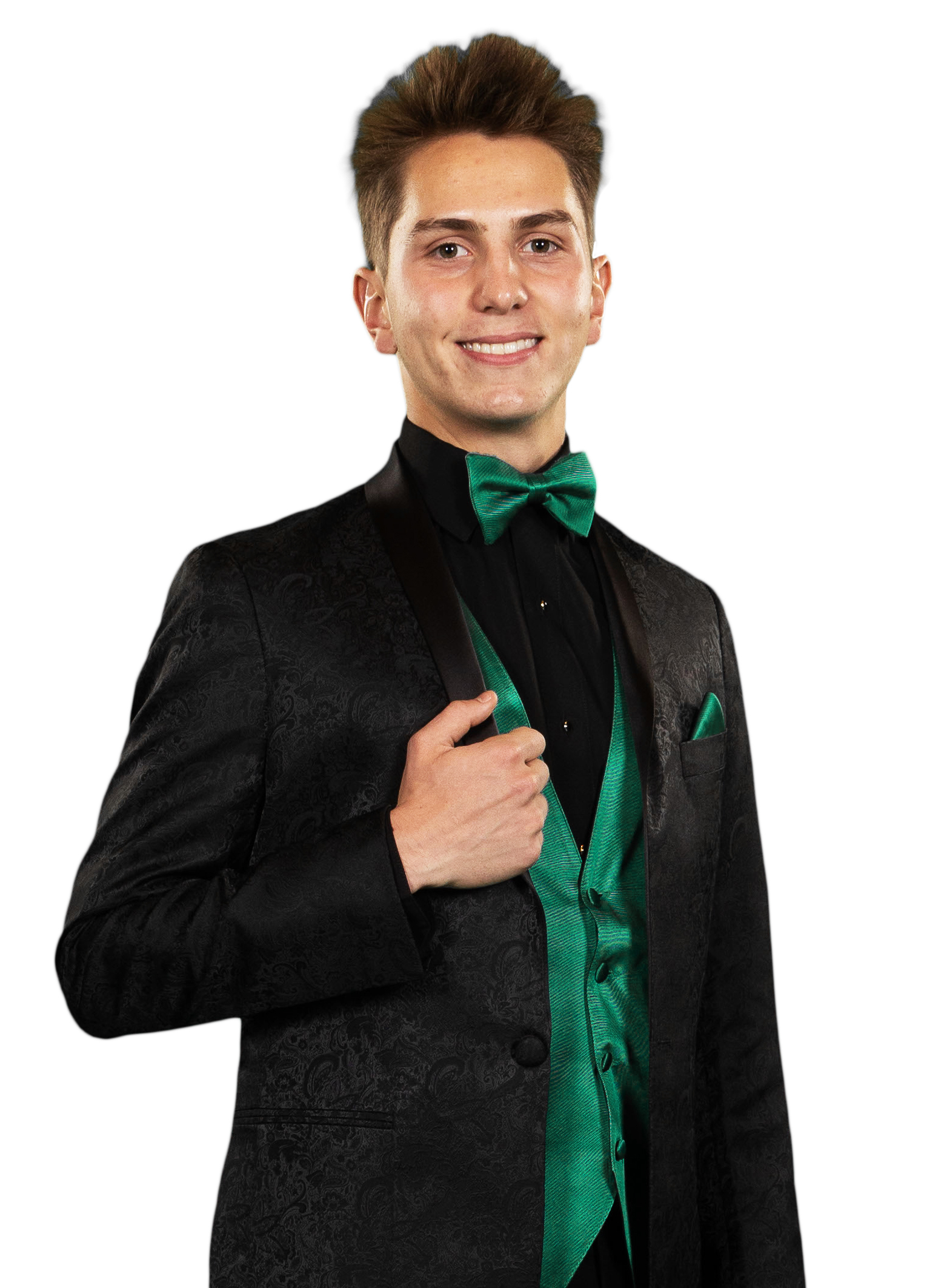 Larr Brio granite paisley slim fit 1-Button shawl tuxedo features side vents and is constructed from lightweight super 120's worsted wool. Includes black slim fit formal trousers.
