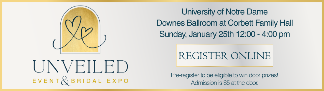 We are delighted to invite you to experience the Unveiled Event & Bridal Expo at the University of Notre Dame—a premier celebration of wedding inspiration, style, and planning, hosted in one of the most iconic venues in the region. Register online here for the 2026 Unveiled Wedding Expo on Sunday, January 25th between 12:00 and 4:00! The show will take place at Downes Ballroom at Corbett Family Hall. Admission is only $5 per person at the door with your online registration. You must pre-register to be entered to win amazing door prizes! We cannot wait to see you at the Unveiled Wedding Expo!